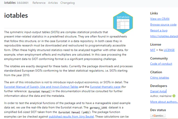 iotables processes all the symmetric input-output tables of the EU member states, and calculates direct, indirect and induced effects, multipliers for GVA, employment, taxation. These are important inputs into policy evaluation, business forecasting, or granting/development indicator design. iotables is used by about 800 experts around the world.
